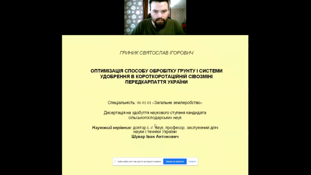 Другою розглянули дисертацію Гринника Святослава на тему «Оптимізація способу обробітку і системи удобрення в короткоротаційній сівозміні Передкарпаття України», де автор розкрив питання оптимізації основного обробітку грунту у сівозміні короткої ротації зза вирощування пшениці ярої залежно від застосування органічних добрив, отриманих на виході біогазових установок для стабілізації і поліпшення родючості грунту.