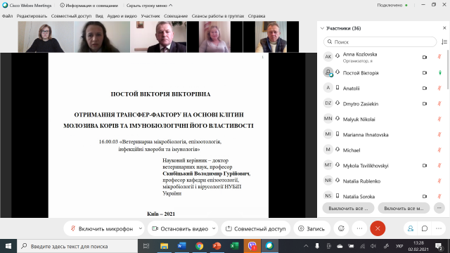 Першим питанням було розглянуто дисертаційну роботу здобувача кафедри епізоотології, мікробіології і вірусології НУБіП України Вікторії Постой на тему: «Отримання трансфер-фактору на основі клітин молозива корів та імунобіологічні його властивості». Науковий керівник - Скибіцький Володимир Гурійович – доктор ветеринарних наук, професор, професор кафедри епізоотології, мікробіології і вірусології.