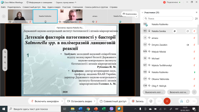 Другим питанням слухали дисертацію Наталії Рубленко, здобувача Державного науково-контрольного інституту біотехнології і штамів мікроорганізмів на тему: «Детекція факторів патогенності у бактерій Salmonella spp. в полімеразній ланцюговій реакції». Науковий керівник – Головко Анатолій Миколайович – доктор ветеринарних наук, професор, академік НААН, директор Державного науково-контрольного інституту біотехнології і штамів мікроорганізмів.
