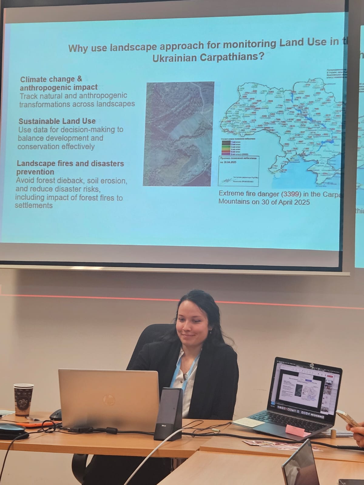 Ірина Зібцева представила результати досліджень, виконаних у межах проєкту “EU4Environment – Water Resources and Environmental Data”, присвячених аналізу змін землекористування у Закарпатській та Івано-Франківській областях протягом 2018-2023 років із використанням методології Corine Land Cover (CLC). Отримані результати показали тенденцію до скорочення площ лісів і екстенсивно використовуваних сільськогосподарських земель на користь розширення орних угідь і перехідних лісових масивів, що створює ризики для екологічної мережі та біорізноманіття регіону.