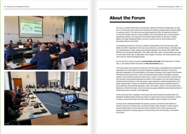 Сесія розпочалася зі згадки про міжнародний форум який передував організації сесії - "Форум з питань лісової науки та освіти в Україні: Потреби та пріоритети співпраці", 21-22 листопада 2023 року, IIASA, Лаксенбург, Австрія. Форум було організовано спільно IIASA, НУБіП України та IUFRO. За результатами форуму було розроблено дорожню карту підтримки української науки та освіти (див.: https://iiasa.ac.at/policy-briefs/apr-2024/forest-science-and-education-in-ukraine-priorities-for-action).