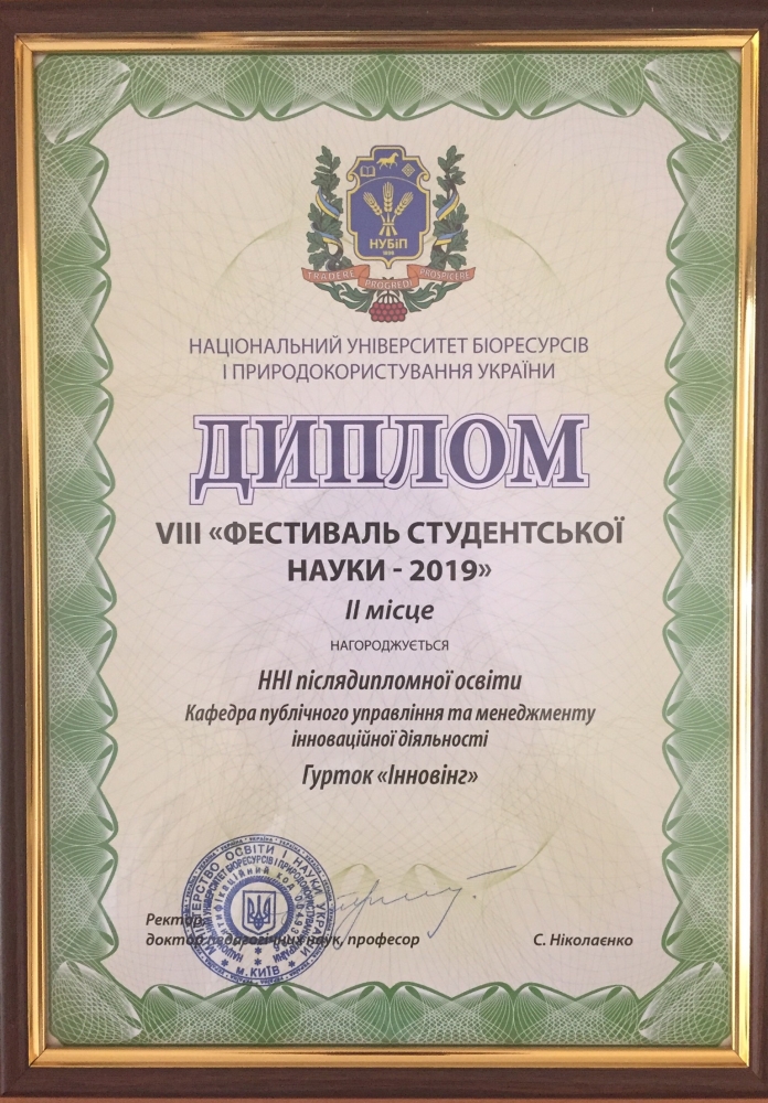 Вшанували і здобутки наукових гуртків – переможців VIІІ «Фестивалю студентської науки – 2019». Друге місце розділив гурток «Інновінг» ННІ післядипломної освіти, який отримав відповідно диплом другого ступеня.