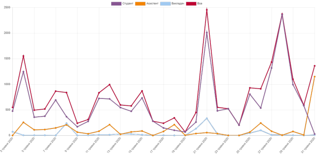 Студенти 9, 10, 11 групи 1 курсу скороченого терміну навчання ОС «Бакалавр» спеціальності «Ветеринарна медицина» успішно виконали програму онлайн навчальної практики. Про активність та наполегливість студентів під час навчальної практики свідчить травневий графік звітності по всім видам діяльності на електронному навчальному курсі «Лікарські рослини». Підтвердженням цьому є три яскравих піки активності студентів, які відповідають термінам проходження навчальної практики.