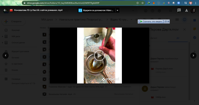 Зафільмований процес виготовлення лікарських форм і викладення відзнятого матеріалу для перегляду у створений спільний google-диск давали студентам додаткові бали. Це дало можливість студентам відчути себе відеоблогерами і навчитись працювати із інструментами дистанційного використання спільних матеріалів.