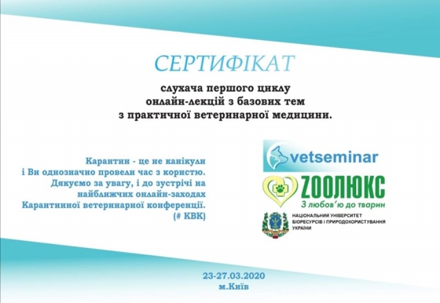 08 квітня – вебінар з інтенсивної терапії дрібних тварин. Теми: Годування – коли та чим? Годування критичних пацієнтів. Правда та міфи. Гостре розширення та заворот шлунку у собак – як збільшити відсоток виживання? Лектор – Іван Якимчук, завідувач відділенням реанімації та інтенсивної терапії клініки «Зоолюкс», аспірант кафедри терапії і клінічної діагностики факультету ветеринарної медицини НУБіП України.