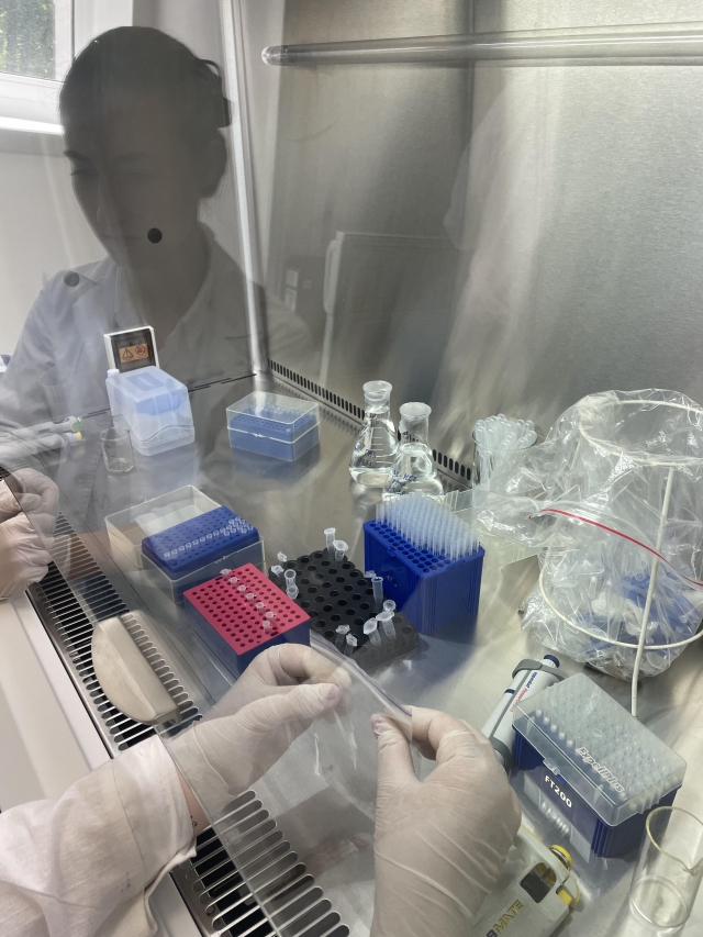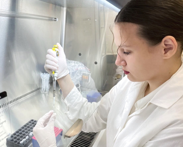 Катерина Андрієнко у ламінарному боксі в процесі підготовки ПЛР суміші