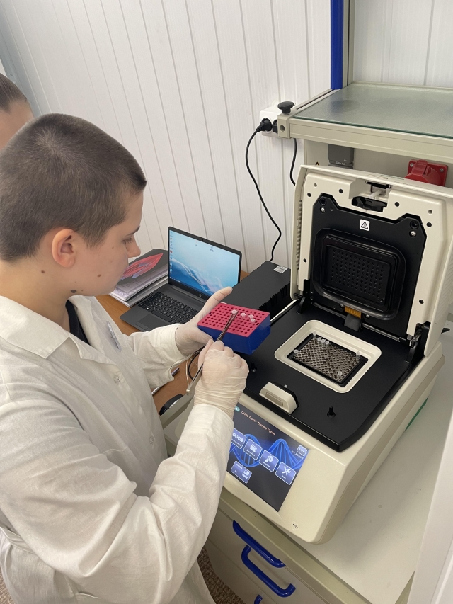 Софія Козлова виконує процедуру ПЛР у реальному часі на ампліфікаторі CFX-96 Touch (Bio-Rad, США)