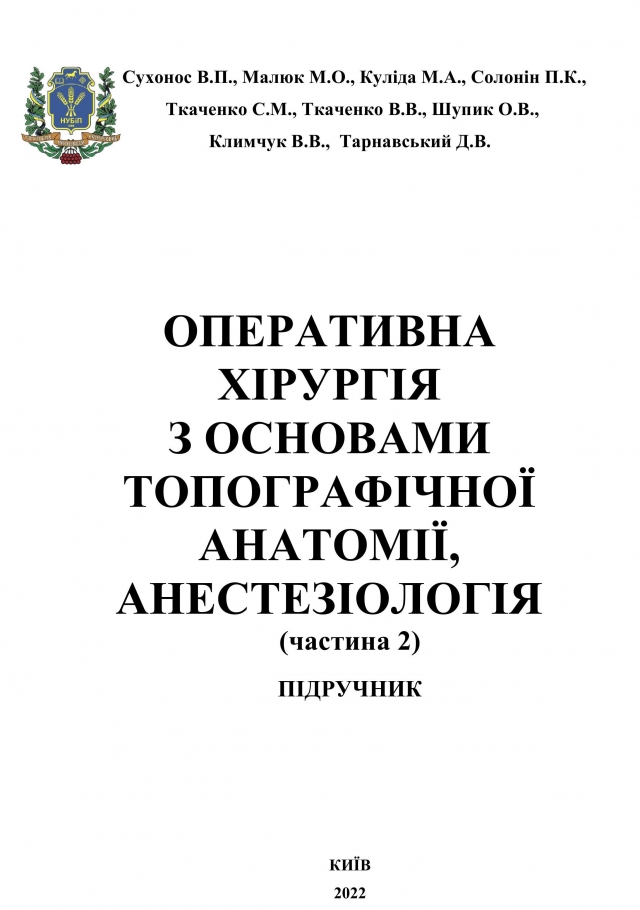 Оперативна хірургія з основами топографічної анатомії, анестезіологія (частина 2) : підручник Сухонос В.П., Малюк М.О., Куліда М.А., Солонін П.К., Ткаченко С.М., Ткаченко В.В., Шупик О.В., Климчук В.В., Тарнавський Д.В. – Київ : НУБіП України, 2022.