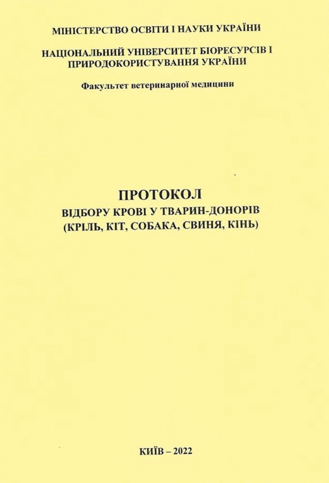 Протокол відбору крові у тварин-донорів (кріль, кіт, собака, свиня, кінь) / Малюк М.О., Мазуркевич А. Й., Харкевич Ю. О., Климчук В. В., Бокотько Р. Р., Савчук Т. Л., Тарнавський Д. В., Єгоров О. В., Горкава І. М., Коваленко Д. О. – Київ : НУБіП України, 2022.
