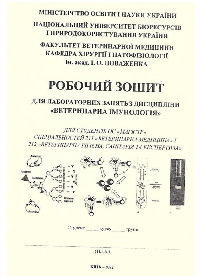 Робочий зошит для лабораторних занять з дисципліни «Ветеринарна імунологія» для студентів ОС «Магістр» спеціальностей 211 «Ветеринарна медицина» і 212 «Ветеринарна гігієна. Санітарія та експертиза» / Малюк М.О., Мазуркевич А. Й., Савчук т. Л., Бокотько Р. Р., Харкевич Ю. О. – Київ : НУБіП України, 2022.