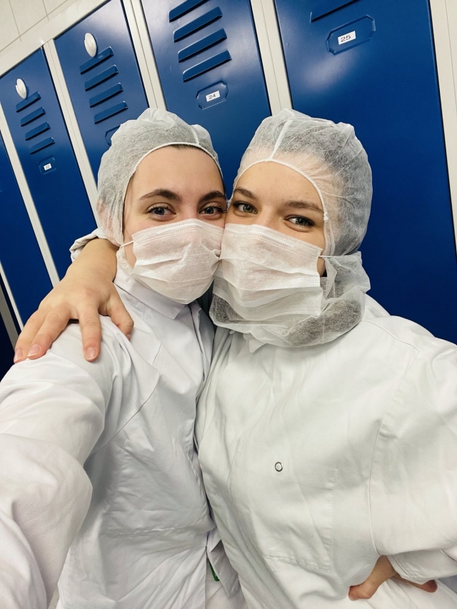 Тернова Альона, студентка 1 року навчання магістратури: «Цьогорічну практику я проходжу на м’ясопереробному заводі Альфайн в Німечині, місто Лаге. Робота заключається в формуванні напівфабрикатів – заморожених бургерів. Перед роботою кожен співробітник проводить санітарну обробку рук (миє, дезінфікує), одягає маску, рукавички, нарукавники, фартухи. У зоні виготовлення бургерів кожні півгодини змінюють рукавички. Я навчалася на лінії-конвеєрі: спочатку на стрічку викладаються булочки, далі по конвеєрній стрічці йде сир, соус, котлета і в кінці руху конвеєру бургери накриваються булочкою. Далі по конвеєру сформовані бургери направляються до цеху пакування. В цеху пакування бургери запаковують в плівку і картонну коробку за допомогою машини для пакування. Після процесу пакування, запаковані бургери обов’язково проходять етап перевірки на цілісність та герметичність упаковки. Останнім етапом виробництва є пакування в ящики партії бургерів і відвантаження на холодильник, де напівфабрикати зберігаються до реалізації.