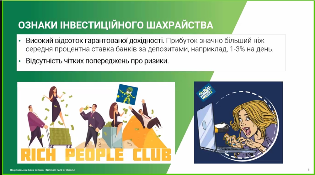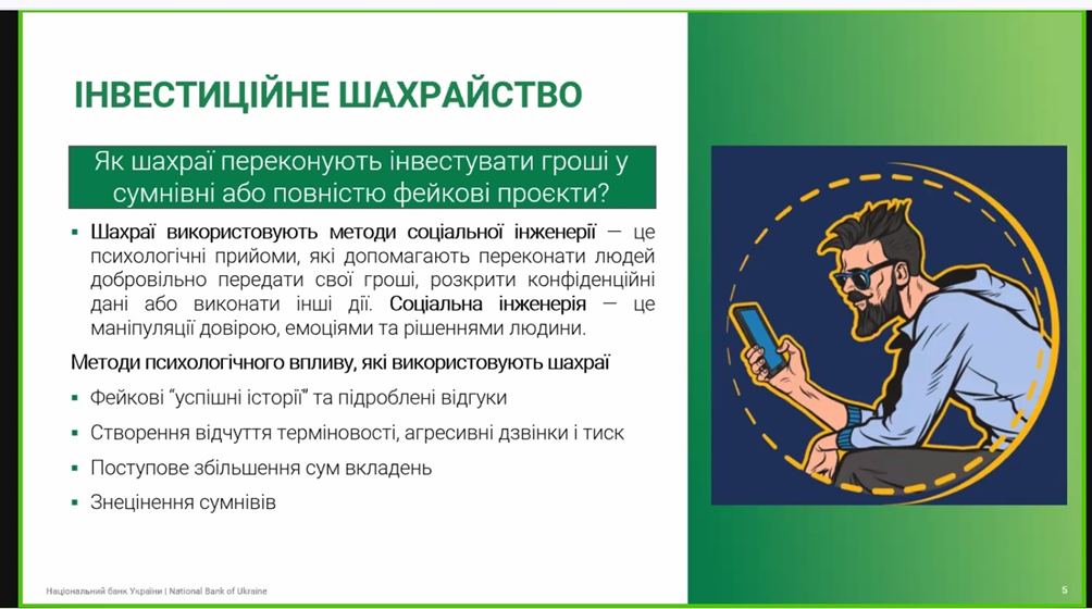 Тема вебінару є актуальною на сьогодні. Учасники у ході вебінару дізналися про найпоширеніші шахрайські схеми та як вони працюють. Також отримали теоретичну інформацію та практичні рекомендації як можна розпізнати шахрайські схеми; що таке фінансовий номер телефону та як його захистити; як можна захистити персональні дані та персональний фінансовий номер; як розпізнати шахрайські пропозиції «легкого заробітку» в інтернеті; як безпечно купувати онлайн та уникати фейкових продавців; як відрізнити шахрайський сайт від справжнього; як захистити свої акаунти в соціальних мережах і месенджерах та ще багато чого цікавого та корисного. Пані Тетяна познайомила слухачів із поняттям “грошові мули”.