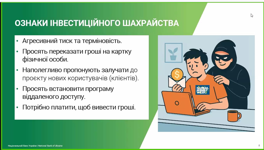 17 березня 2026 р. відвідали вебінар від керівниці напряму інформаційних кампаній Національного банку України Тетяни МАШЛАКОВСЬКОЇ на тему “Шахрай Гудбай: актуальні схеми шахрайства та як їм протидіяти”