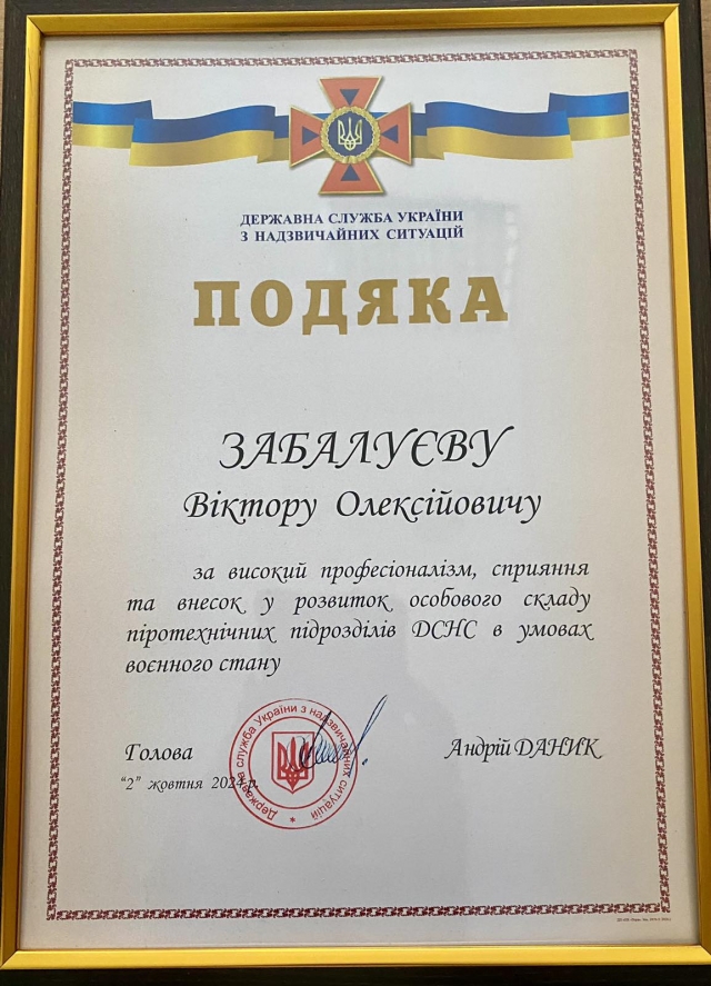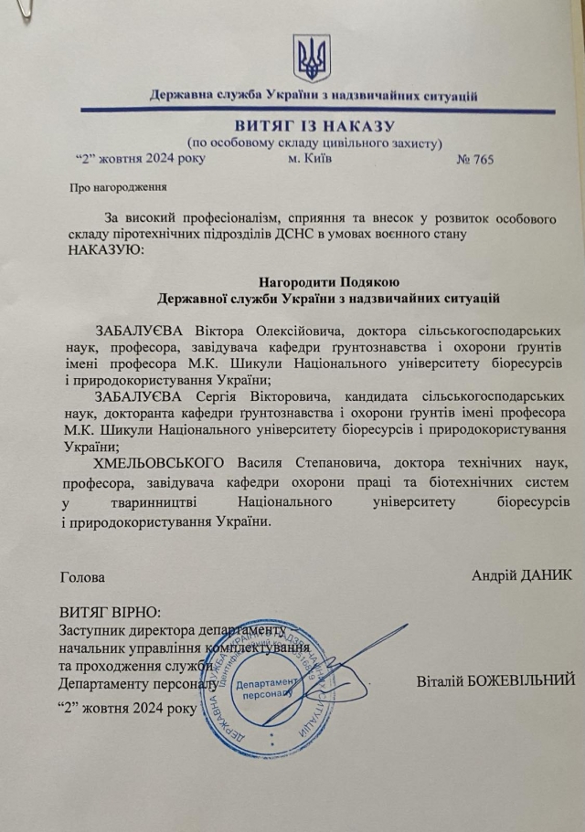 Державна служба України з надзвичайних ситуацій відзначила Подякою завідувача кафедри Забалуєва Віктора Олексійовича і докторанта кафедри ґрунтознавства та охорони ґрунтів ім. М.К. Шикули Забалуєва Сергія Вікторовича за високий професіоналізм, сприяння та внесок у розвиток особового складу піротехнічних підрозділів ДСНС в умовах воєнного стану.