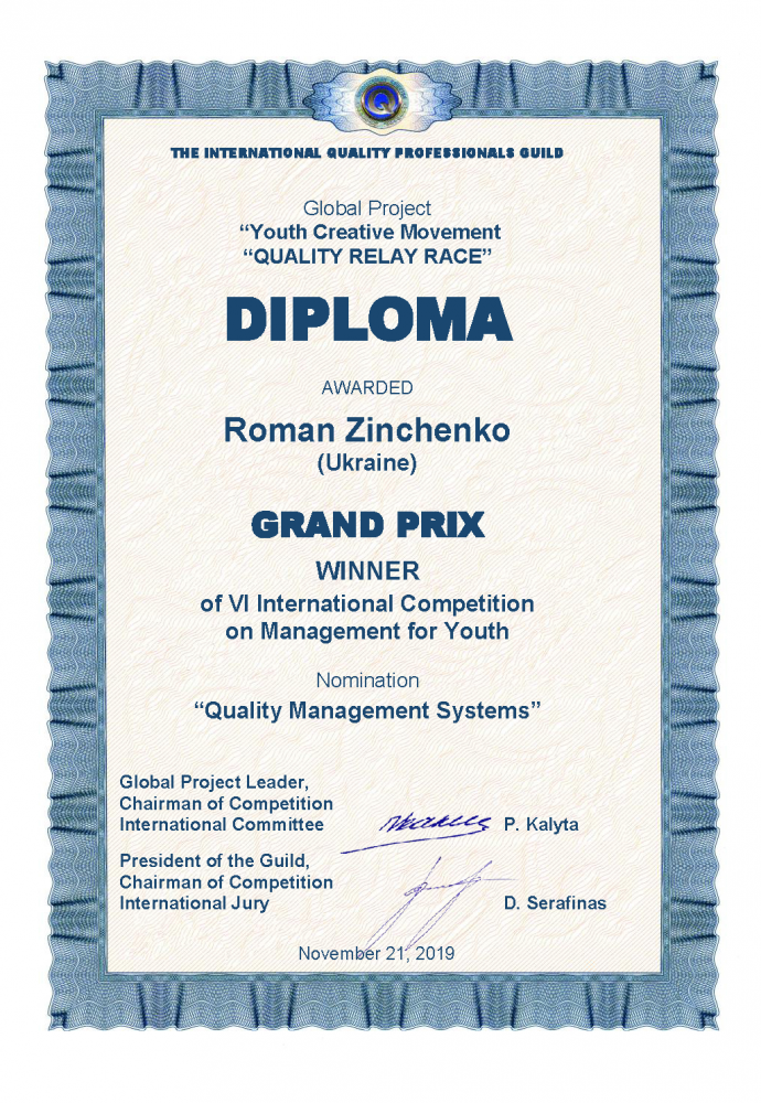 21 листопада 2019 року з метою підготовки, виявлення та заохочення молодих фахівців, що мають знання і кваліфікацію, які дозволяють їм сприяти сталого розвитку своїх країн і підвищення рівня якості життя людей; мотивації до підвищення рівня знань молодих фахівців в сфері менеджменту, зокрема, знань і розуміння вимог міжнародних стандартів ISO серії 9000, інших стандартів, концепцій, моделей і методів менеджменту; розвитку у молоді здатності застосовувати знання в сфері ділової досконалості і якості на практиці, а також передавати їх своїм колегам в середовищі молодого покоління фахівців в сфері менеджменту та розвитку співпраці між молодими фахівцями в сфері якості та менеджменту як всередині країн, так і на міжнародному рівні у м. Києві в Національному університеті біоресурсів і природокористування України в рамках Форуму «Дні якості - 2019» відбувся заключний тур Гран-прі VІ Міждержавної олімпіади з менеджменту серед молоді.