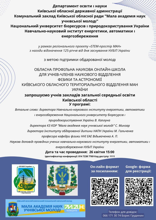 У рамках регіонального проєкту «STEM-простір МАН» з нагоди відзначення 125-річчя від дня заснування Національного університету біоресурсів і природокористування України з метою підтримки обдарованої молоді відбулася обласна профільна наукова онлайн-школа з фізики та астрономії.