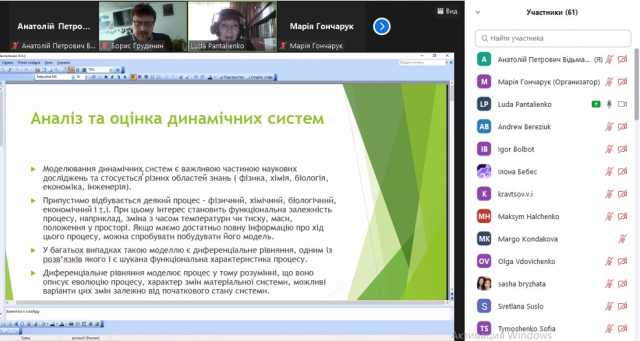 Доповідачка зазначила, що теорія динамічних систем – це галузь математичної науки, яка вивчає проблематику аналізу систем, параметри яких змінюється в часі. Теорія динамічних систем, як дисципліна, є природним узагальненням досліджень в класичній механіці та диференціальних рівняннях. Хоча на теперішній момент теорія динамічних систем є математичною дисципліною, спочатку вона була частиною фізики.