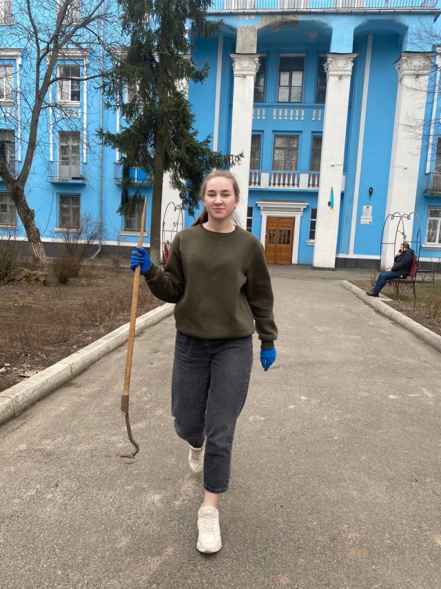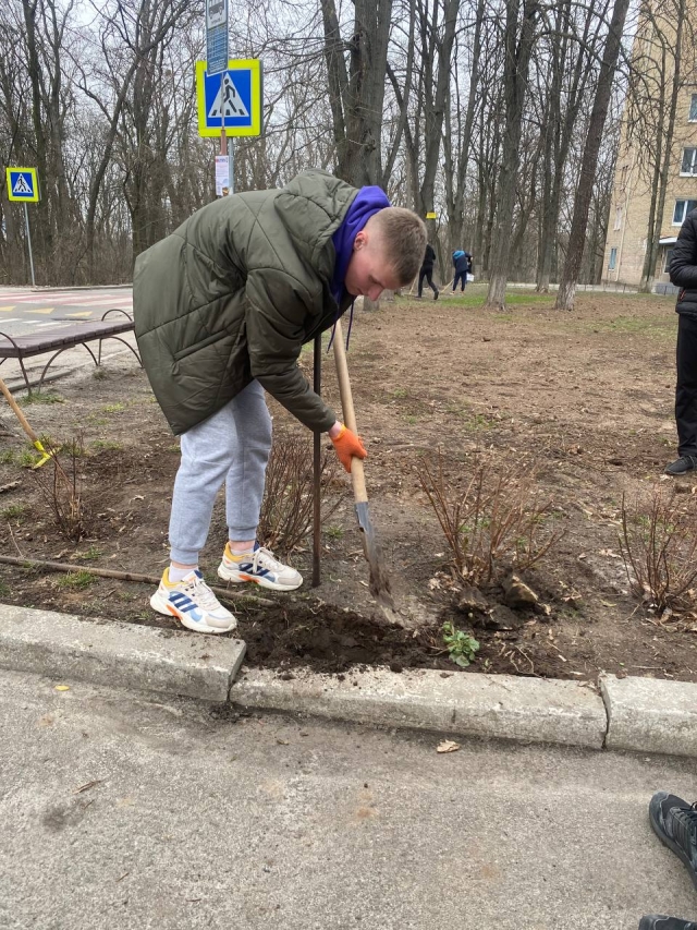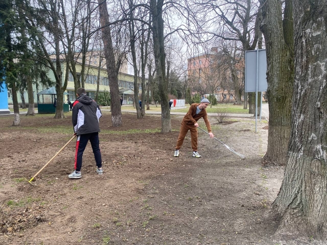 Студенти та викладачі попрацювали також біля студентського гуртожитку №1, зокрема прибрали торішнє листя, вирівняли ділянку та посадили молоді дерева та кущі.