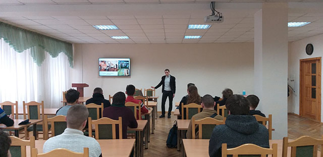 Олена Пінчевська і Андрій Спірочкін ознайомили майбутніх абітурієнтів з основними перевагами навчання саме в нашому Університеті, звернули увагу на потужну матеріально-технічну базу яка, за сприяння Ректорату, постійно розвивається, потужний і збалансований кадровий склад НПП, а також на зручне розташування студентського кампусу. Окрему увагу було приділено тому, чим будь які викладачі пишаються найбільше – випускникам кафедри, а це керівники та провідні фахівці вітчизняних та закордонних деревообробних та меблевих підприємств.