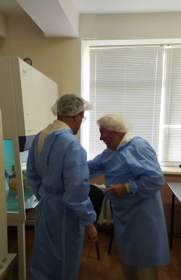 Зустріч розпочалась із ознайомлення із матеріально-технічним оснащенням наукової лабораторії. Прискіпливий та допитливий, уважний і доброзичливий, Вадим Кондратюк цікавився вартістю кожного реактиву, умовами зберігання біологічного матеріалу в кріобанку, режимом роботи в боксах, станом забезпечення роботи СО2–інкубаторів, використання в дослідженнях спеціальних мікроскопів, вмістом холодильників для зберігання реактивів, веденням журналів досліджень, умовами дотримання принципів асептики та антисептики в роботі з біологічним матеріалом, наявністю відповідних нормативних документів, і зокрема дозволів локальної комісії з біоетики на проведення досліджень. Серед багатьох інших запитань не обійшли увагою і питання формування наукової школи, кількість учнів та їх роль в діяльності Центру.