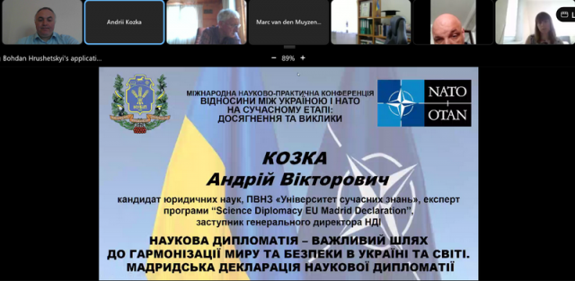 З Мадридською Декларацією наукової дипломатії ознайомив учасників, кандидат юридичних наук, ПВНЗ «Університет сучасних знань», експерт програми «Science Diplomacy EU Madrid Declaration», заступник генерального директора НДІ Андрій КОЗКА, підкресливши, що наукова дипломатія – важливий шлях до гармонізації миру та безпеки в Україні та світі. Основними акторами міжнародних відносин є солдат і дипломат, тому Мадридська декларація є відповддю на глобальні виклики.