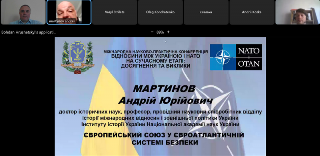 Роль ЄС у євроатлантичній системі безпеки розкрив у своїй доповіді доктор історичних наук, професор, провідний науковий співробітник відділу історії міжнародних відносин і зовнішньої політики України Інституту історії України НАНУ Андрій МАРТИНОВ, який зазначив, що європейська система безпеки сьогодні знаходиться в турбулентному стані.