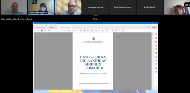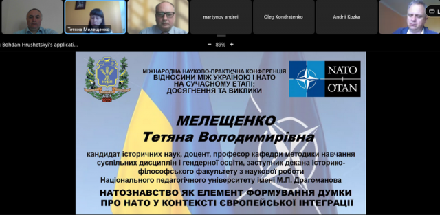 Подоланню стереотипу сприйняття НАТО українським суспільством, як військового потенціалу, необхідності роз’яснювати високі стандарти демократії присвячена кандидата історичних наук, доцента, професора кафедри методики навчання суспільних дисциплін і гендерної освіти, заступника декана історико-філософського факультету з наукової роботи Національного педагогічного університету імені М.П.Драгоманова Тетяна МЕЛЕЩЕНКО, яка презентувала посібник з натознавства «НАТО, сила, що захищає мирних громадян».