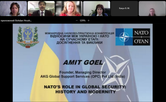 Генеральний Директор кампанії AKR Global Support Services (OPC) Pvt Ltd Amit GOEL (India) висловив громадянську позицію на захист України в умовах російського вторгнення. В своїй доповіді п. Гоель охарактеризував структуру організацій НАТО, їх напрями діяльності, протидію російській агресії, окремо виділивши наслідки останньої в глобальному масштабі – ріст цін на сировинні ресурси та загрози агропродовольчій безпеці.