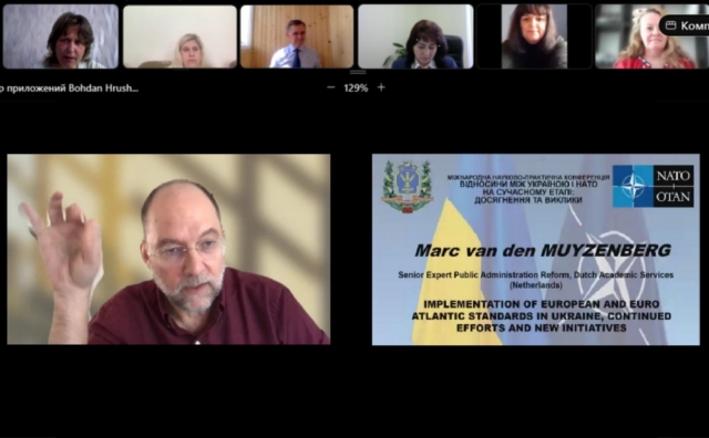 З доповіддю виступив Marc van den MUYZENBERG, Senior Expert Public Administration Reform, Dutch Academic Services (Netherlands), який зазначив, що уповноважений представити документ, спрямований на реальну і конкретну співпрацю між Dutch Academic Services та Амстердамським вільним університетом і зацікавленими науковими установами і навчальним закладами України в дослідженнях змін у ставленні суспільства до НАТО, ЄС, РФ тощо.