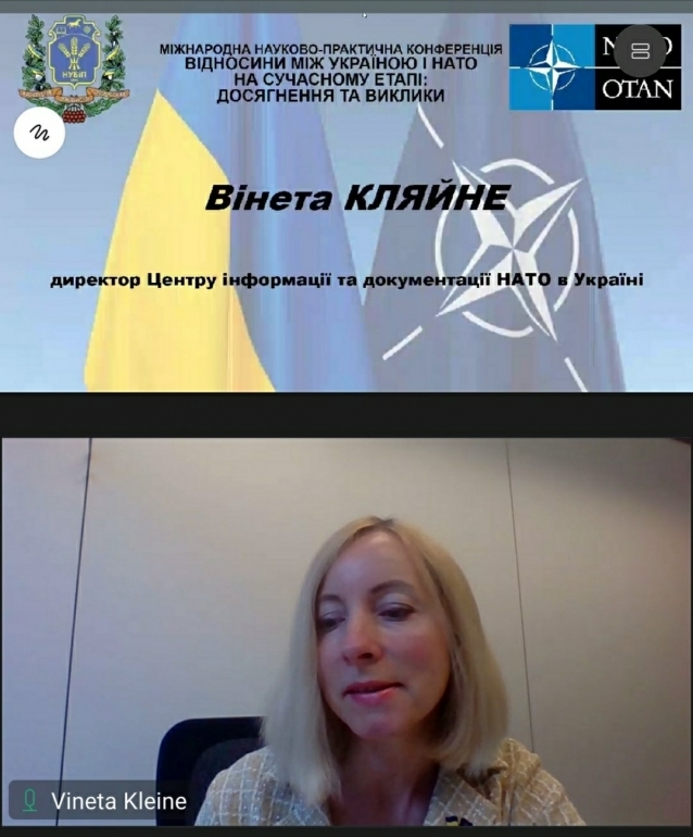 Директор центру інформації та документації НАТО в Україні Вінетта КЛЯЙНЕ поінформувала учасників щодо безпекових і гуманітарних напрямів діяльності цієї організації. Вона наголосила, що громадяни країн НАТО продемонстрували найвищий рівень підтримки України та українців. «Ми, як і раніше, сповнені рішучості підтримувати скоординований міжнародний тиск на Росію, і ми будемо продовжувати тісно співпрацювати з відповідними зацікавленими сторонами та іншими міжнародними організаціями, включаючи Європейський Союз. Трансатлантична координація залишається вирішальною для ефективної відповіді на нинішню кризу», — зазначила у своїй доповіді пані Кляйне.