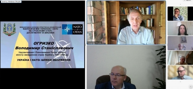 Надзвичайний і Повноважний Посол України, міністр закордонних справ України у 2007-2009 рр. Володимир ОГРИЗКО у своєму виступі висловив сподівання, що Україна і НАТО стануть колегами у спільній безпековій системі. Причинами повномасштабної агресії РФ проти України стало те, що західні країни не хотіли бачити сутності Росії, беручи до уваги тільки поверхневі прояви демократії; економічні інтереси бізнес-еліт, які не бажали втрачати мільярдні прибутки; цинізм міжнародної політики – інтересами малих країн часто нехтують. Отже, сьогоднішня ситуація є боротьбою світової демократії і тоталітаризму. За умови поразки демократії на світ чекають важкі часи. Потрібно створювати нову систему колективної безпеки, яка об’єднає виключно демократичні країни. На думку п. Огризка, Україна і НАТО прийдуть до об’єднання після активної фази військових дій, але цьому має передувати практична і серйозна робота і з української сторони, і з боку НАТО.