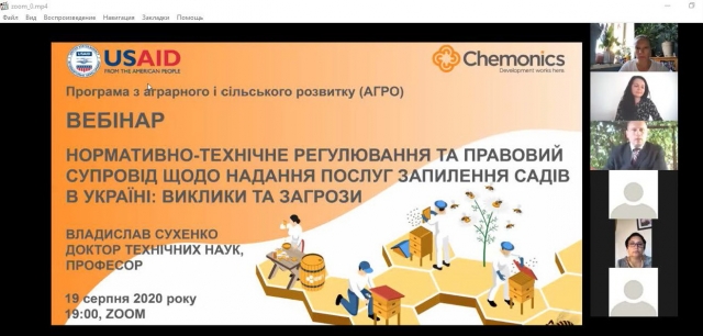 Під час налагодження зв’язків та організації роботи платформи керованого бджолозапилення, зіткнулися з проблемами необізнаності гравців ринку запилення у правовому полі. Тому, 19.08.2020 року на базі кафедри стандартизації та сертифікації сільськогосподарської продукції та за підтримки Програми USAID з аграрного та сільського розвитку було організовано освітньо-практичний вебінар «Нормативно-технічне регулювання та правовий супровід щодо надання послуг запилення садів в Україні”. Спікер, завідувач кафедри, професор, доктор технічних наук Владислав Сухенко розкрив наступні питання: основні положення керованого запилення, законодавча база для здійснення запилення, покрокова інструкція дій, визначення ролей, ризики та критерії оцінки надання послуг, вартість.