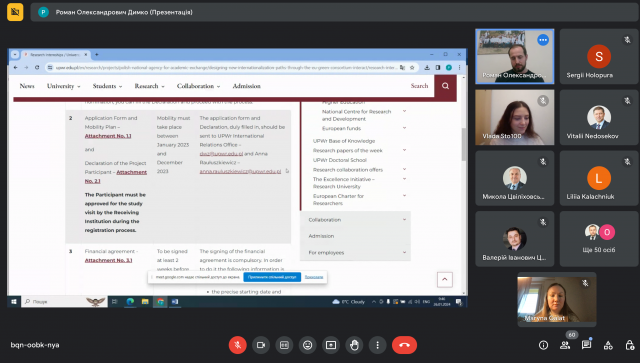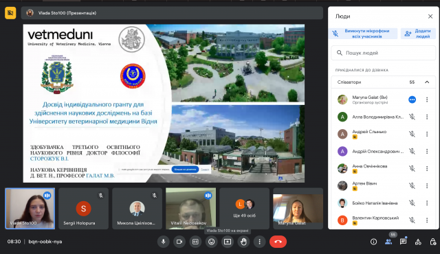 Наступною у ході вебінару була перша сесія заходу «Індивідуальні грантові програми». У цій сесії були виступи керівниці міжнародних програм факультету ветеринарної медицини Марини Галат, учасниці стажування за програмою Erasmus+ у Віденському університеті ветеринарної медицини (м. Відень, Австрія), здобувачки третього освітньо-наукового рівня доктор філософії ОНП «Заразна патологія тварин» Владислави Сторожук і старшого викладача кафедри ветеринарної гігієни ім. професора А.К. Скороходька Романа Димка. У ході обговорення своїм досвідом поділились доцент кафедри біохімії і фізіології тварин ім. акад. М.Ф. Гулого Валерій Цвіліховський, здобувач третього освітньо-наукового рівня доктор філософії Олександр Вержиховський і завідувач кафедри анатомії, гістології і патоморфології тварин ім. акад. В.Г. Касьяненка Олег Мельник, які побажали учасникам заходу активізувати зусилля у напрямку отримання грантів і грантових програм.