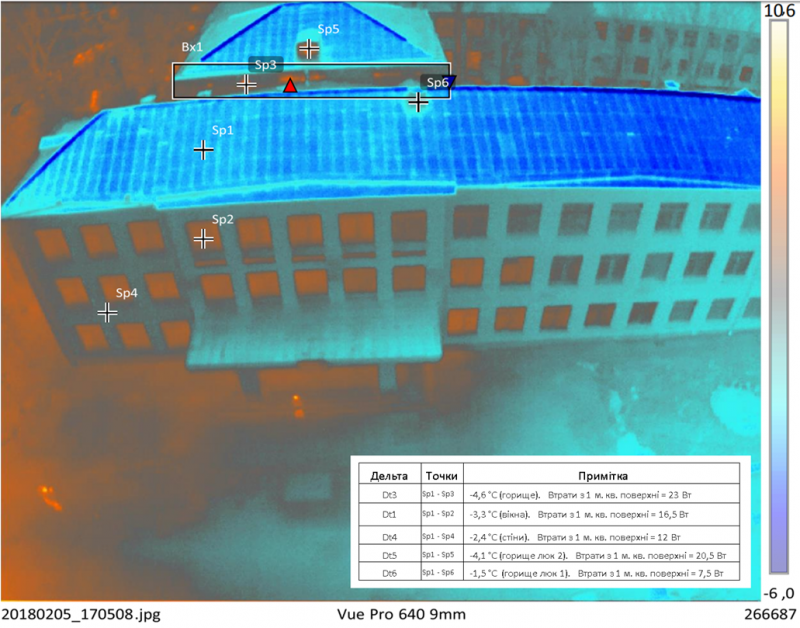 Зображення навчального корпусу №8 із зазначенням теплових втрат, отримане із використанням БПЛА