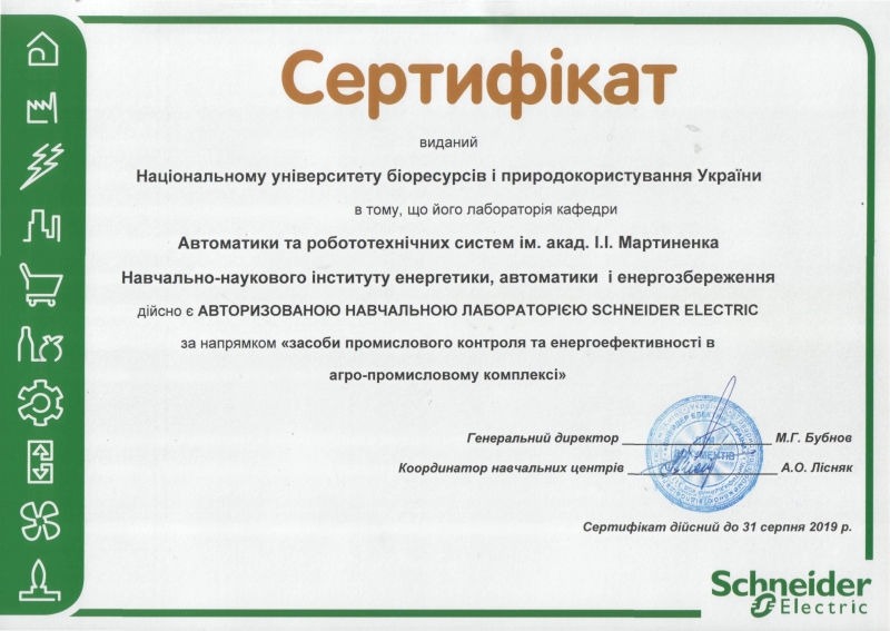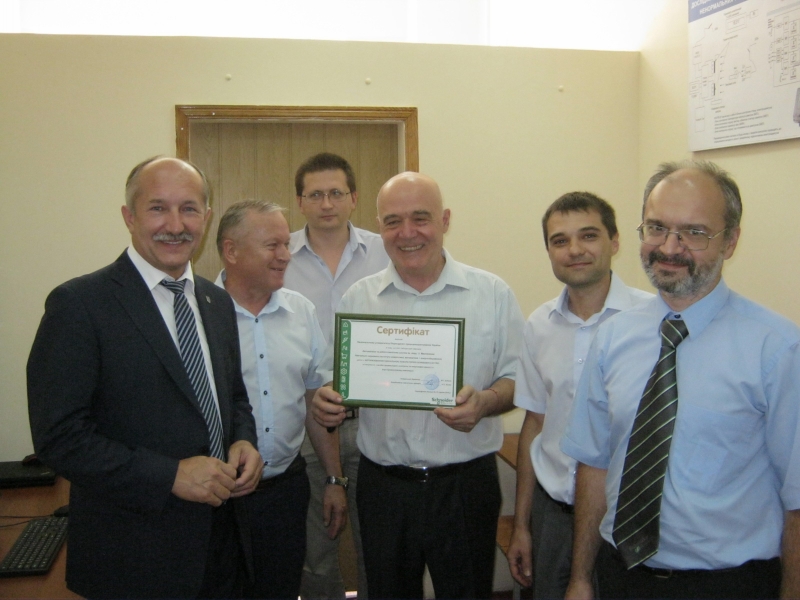 І ось нарешті 30 серпня 2016 р. у присутності представників ТОВ «Шнейдер Електрик Україна» Антона Лісняка, координатора навчальних центрів, Юрія Карпуся, керівника групи маркетингу, Віталія Устимчука, продакт-менеджера (Юрій і Віталій – це випускники нашого інституту), Сергія Кваші, проректора з навчальної та виховної роботи, Володимира Козирського, директора ННІ енергетики, автоматики та енергозбереження, великої групи гостей кафедри авторизована навчальна лабораторія Schneider Electric була урочисто відкрита, а університету вручено сертифікат її відповідності вимогам фірми Schneider Electric. Зазначене дозволить проводити не лише заняття зі студентами, а і підвищувати кваліфікацію інженерного персоналу з автоматизації, використовуючи при цьому бренд знаменитої фірми.