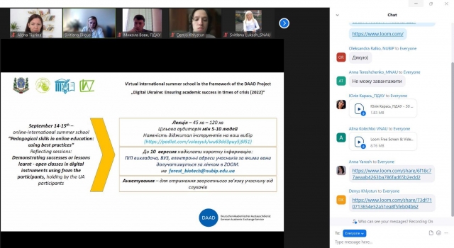 На початку літньої школи з вітальним словом до учасників звернувся координатор проєкту проф., д-р Ральф Шлаудерер. Презентацію проєкту DAAD «Україна цифрова: забезпечення академічної успішності під час кризи (2022)» і провела модератор літньої школи, доцент кафедри ботаніки, дендрології та лісової селекції Світлана Білоус (Національний університет біоресурсів і природокористування України).