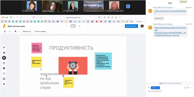 На занятті були присутні декан факультету аграрного менеджменту Анатолій Остапчук, доценти кафедри адміністративного менеджменту та ЗЕД Наталія Коваленко, Олена Ковтун, Ольга Костюк, Олександр Файчук, Іван Міщенко, Альона Тюріна, доцент кафедри виробничого та інвестиційного менеджменту Тетяна Лобунець, аспірант Денис Хлистун. Наприкінці, всі учасники підсумували досвід розподілу студентів на команди з використанням Jamboard.