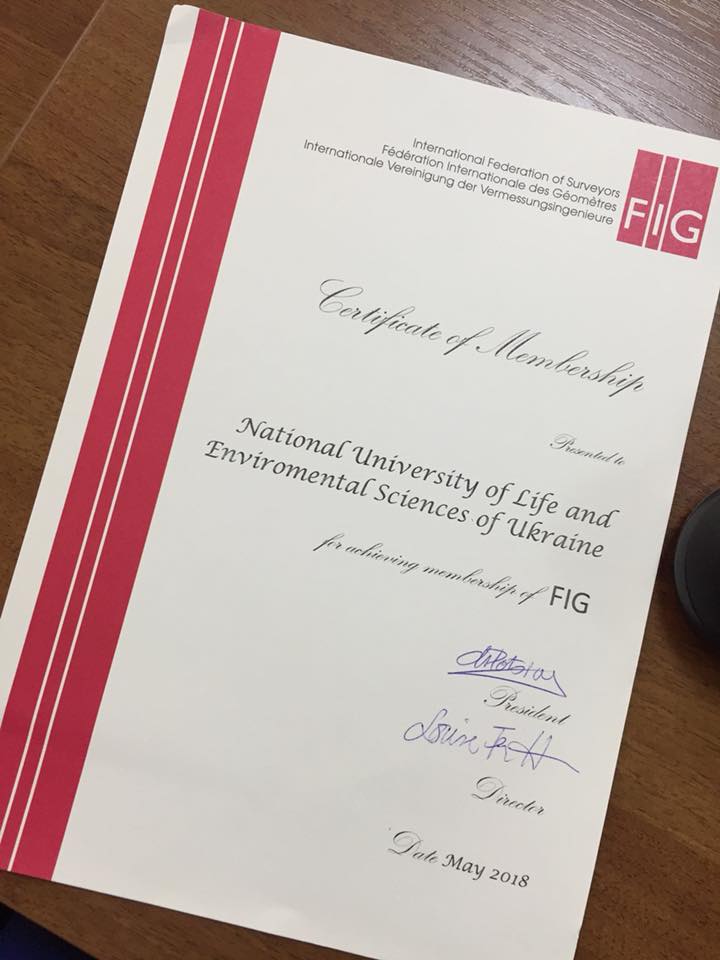 Черговим визнанням НУБіП України у справі підготовки фахівців за спеціальністю «Геодезія та землеустрій» стало надання нашому університету на 41-й Генеральній асамблеї Міжнародної федерації геодезистів (FIG), яка пройшла у Стамбулі 6 травня 2018 року, статусу академічного члена цієї провідної міжнародної організації, що представляє інтереси геодезистів у всьому світі, об’єднує профільні національні асоціації із більш ніж 120 країн та охоплює весь спектр професійних сфер у глобальному геодезичному співтоваристві. FIG, що заснована у 1878 році, є найбільшим міжнародним майданчиком для обговорення, розвитку та пропагування кращих професійних практик та стандартів. Статус FIG визнається ООН та Світовим банком.