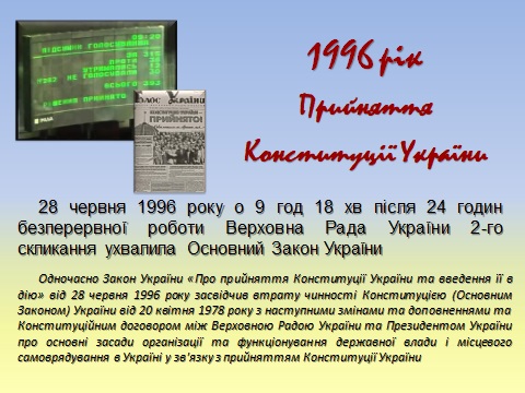 Відомим є той факт, що 28 червня 1996 року о 9 год. 18 хв. після майже 24 годин безперервної праці Верховна Рада України прийняла і ввела в дію Конституцію України. За основний закон проголосувало 315 депутатів, 36 було проти, 12 утримались. Це був тяжкий процес, який повністю легалізував та утвердив незалежність нашої держави.