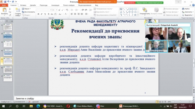 Головою вченої ради Анатолієм Остапчуком винесене на розгляд питання рекомендації до присвоєння вчених звань доцента кандидатам економічних наук кафедри маркетингу та міжнародної торгівлі, виробничого та інвестиційного менеджменту. Одноголосним рішенням вченої ради всі претенденти рекомендовані до присвоєння вчених звань на розгляд вченої ради НУБіП України.