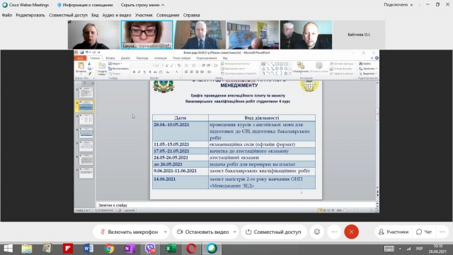 26 квітня на засіданні вченої ради обговорили питання підготовки до проведення атестаційного екзамену та захисту бакалаврських кваліфікаційних робіт студентами 4 курсу денної форми навчання, про що доповіла заступник декана Лариса Карпенко.