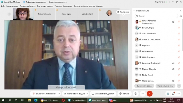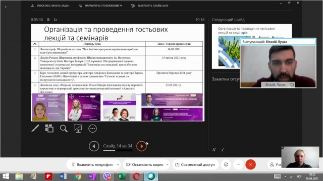 Виконуючий обов’язки завідувача кафедри адміністративного менеджменту та зовнішньоекономічної діяльності Віталій Луцяк, прозвітував про результати роботи калективу кафедри та поточні завдання на 2021 рік в контексті Голосіївської ініціативи-2025.