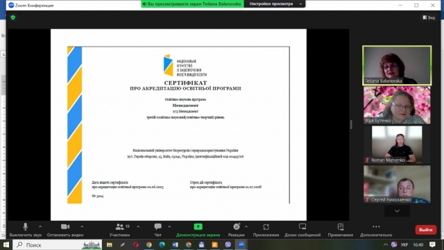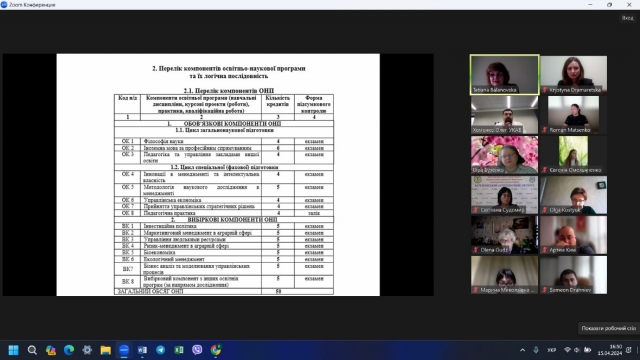 15 квітня 2024 року відбулося обговорення проєкту оновленої освітньо-наукової програми «Менеджмент» підготовки здобувачів третього (освітньо-наукового) рівня вищої освіти зі спеціальності 073 Менеджмент. На обговоренні були присутні к.е.н., завідувач відділу аспірантури Вакуленко Віталій Леонідович, гарант освітньо-наукової програми к. е. н., професор, завідувач кафедри менеджменту ім. професора Й.С. Завадського Балановська Тетяна Іванівна, члени проєктної групи д. е. н., професор, професор кафедри економічної теорії, заступник декана факультету аграрного менеджменту Бутенко Віра Михайлівна, д. е. н., професор, професор кафедри виробничого та інвестиційного менеджменту Дєліні Марина Миколаївна, к. е. н., доцент, доцент кафедри адміністративного менеджменту та зовнішньоекономічної діяльності Костюк Ольга Дмитрівна, здобувач третього (освітньо-наукового) рівня вищої освіти зі спеціальності 073 Менеджмент Маценко Роман Васильович, а також доценти кафедри менеджменту ім. проф. Й. С. Завадського к. е. н., доцент Гогуля Ольга Петрівна, к. е. н., доцент Гавриш Оксана Миколаївна, к. е. н., доцент Драмарецька Кристина Павлівна, здобувач другого (магістерського) рівня вищої освіти ОПП «Менеджмент організації і адміністрування» за спеціальністю 073 «Менеджмент» Ніколаєнко Сергій Олександрович та запрошені стейкхолдери: д. е. н., професор, член-кореспондент НААН, заступник директора з науково-проектної роботи ННЦ «Інститут аграрної економіки», експерт ФАО в Україні Ходаківська Ольга Василівна, д. е. н., професор, головний науковий співробітник відділу форм і методів господарювання в агропродовольчому комплексі ДУ «Інститут економіки та прогнозування» Попова Ольга Леонтіївна, д. е. н., професор, професор кафедри менеджменту Державного університету інформаційно-комунікаційних технологій Гудзь Олена Євгенівна, д. е. н., професор, професор кафедри економіки підприємства, завідувач відділу навчально-науково-інноваційної діяльності ВП НУБіП України «Бережанський агротехнічний інститут» Судомир Світлана Михайлівна, к. т. н., старший науковий співробітник Інституту технічної теплофізики НАН України, експерт Біоенергетичної асоціації України Драгнєв Семен Васильович, начальник відділу методології ціноутворення та аналізу цінової ситуації управління цінової політики департаменту розвитку реального сектору економіки Міністерства економіки України Прокопенко Роман Андрійович, генеральний директор асоціації «Український клуб аграрного бізнесу» Хоменко Олег Миколайович, спеціаліст навчального центру компанії Linkos Group, член розробників програмного забезпечення M.E.Doc Кім Артем Сергійович, фахівець по роботі з клієнтами ТОВ «Кортева Агрісаєнс Україна» Омельяненко Євгенія Олександрівна, HR бізнес партнер Компанії Kraken Leads Махновець Марія Юріївна.