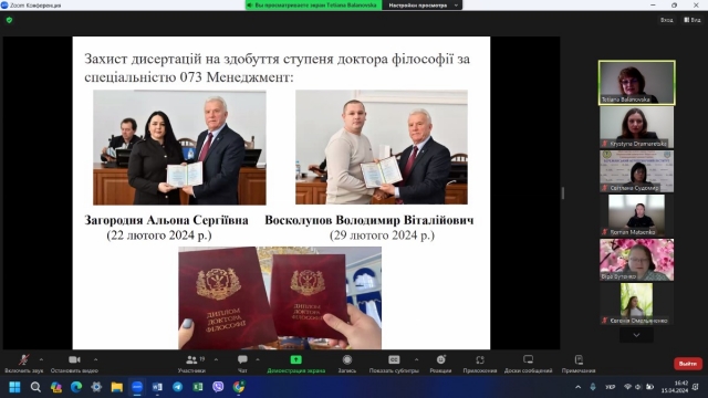 Гарант програми зазначила, що у лютому 2024 року здобувачі вищої освіти освітньо-наукової програми «Менеджмент» Альона Загородня та Володимир Восколупов успішно захистили дисертації на здобуття ступеня доктора філософії зі спеціальності 073 Менеджмент.