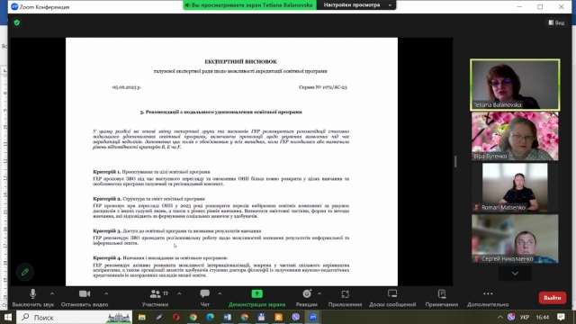 Тетяна Балановська подякувала всім присутнім за співпрацю та зазначила, що всі цінні пропозиції стейкхолдерів, надані під час попередніх обговорень, були враховані при оновлення освітньо-наукової програми.