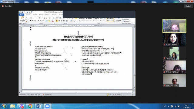 Наступною доповідачкою була гарант освітньо-професійної програми «Менеджмент організацій і адміністрування» Ольга Гогуля, яка детально зупинилась на основних складових освітньої програми: її меті, особливостях, програмних компетентностях та результатах навчання, ресурсному забезпеченню реалізації програми тощо. Для презентації освітніх компонентів та в цілому навчального плану програми Ольга Петрівна передала слово своєму колезі, члену проєктної групи Олександру Новаку.