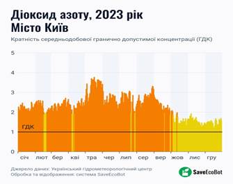 Дещо інші результати показав аналіз даних 16 стаціонарних постів спостережень Центральної геофізичної обсерваторії ім. Бориса Срезневського (ЦГО), виконаний фахівцями громадської організації Save Dnipro. Дані, отримані від ЦГО у табличному форматі і перетворені в наочні графіки системою SaveEcoBot свідчать про 2-3 разове перевищення ГДК по діоксиду азоту протягом перших 9 місяців 2023 року.