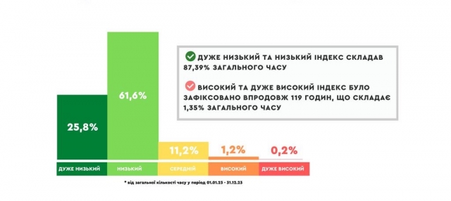 Результати моніторингових спостережень, отриманих на 46 індикативних і 7 референтних автоматичних станціях, презентував директор Департаменту Олександр Возний. За його словами з 1 січня по 31 грудня 2023 року якість атмосферного повітря в Києві була прийнятної якості тобто 87,39% загального часу.