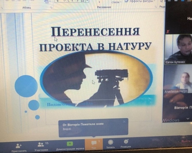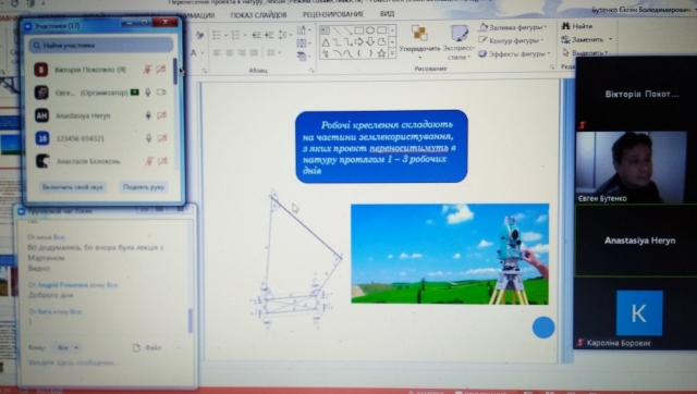 Під час відеоконференції за допомогою інструменту «Демонстрація екрану» лектором була представлена презентація до лекції у якій були розглянуті основні поняття, способи перенесення проекту в натуру, підготовчі роботи, складання робочого креслення із перенесення проекту в натуру методом промірів.