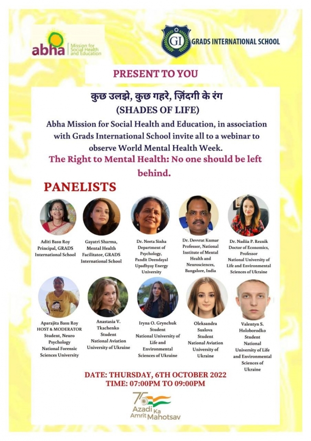 6 жовтня Команда Abha Mission SHE і Grads International School (Індія) за участю викладачів, аспірантів та студентів Національного університету біоресурсів та природокористування України та Національного авіаційного університету (Україна) провели онлайн захід на тему: «Програма поінформованості про психічне здоров’я».